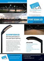 The ELA Sport Beam LED Series of luminaires are high performance sports luminaires, proudly designed and manufactured in Australia. With many years excelling in environmental HID type floodlights, the ELA design team have re-invented low pole sports lighting with the Sport Beam LED Series.